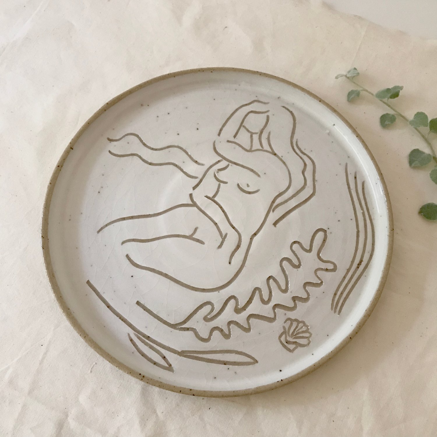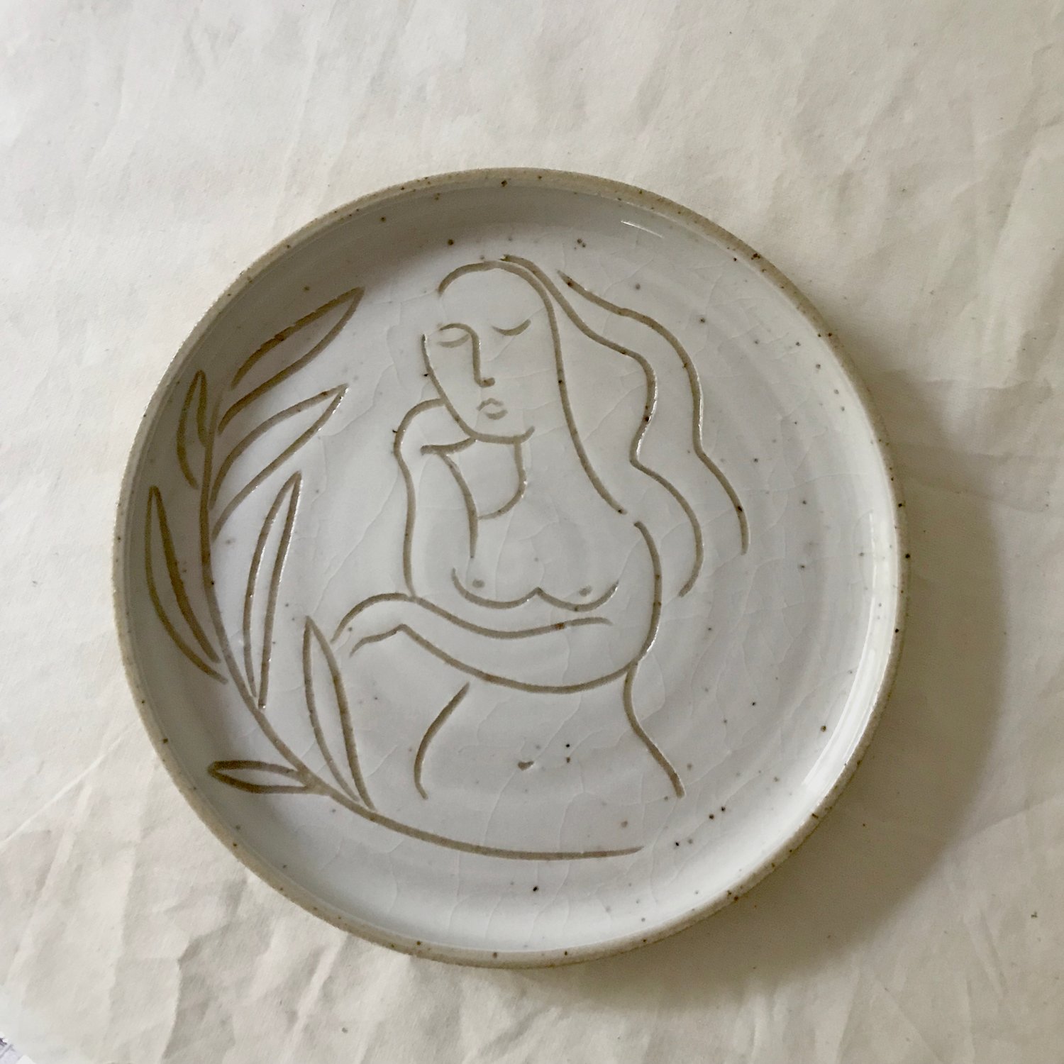 illustrated female motifs on a shiny white glaze with subtle speckles.