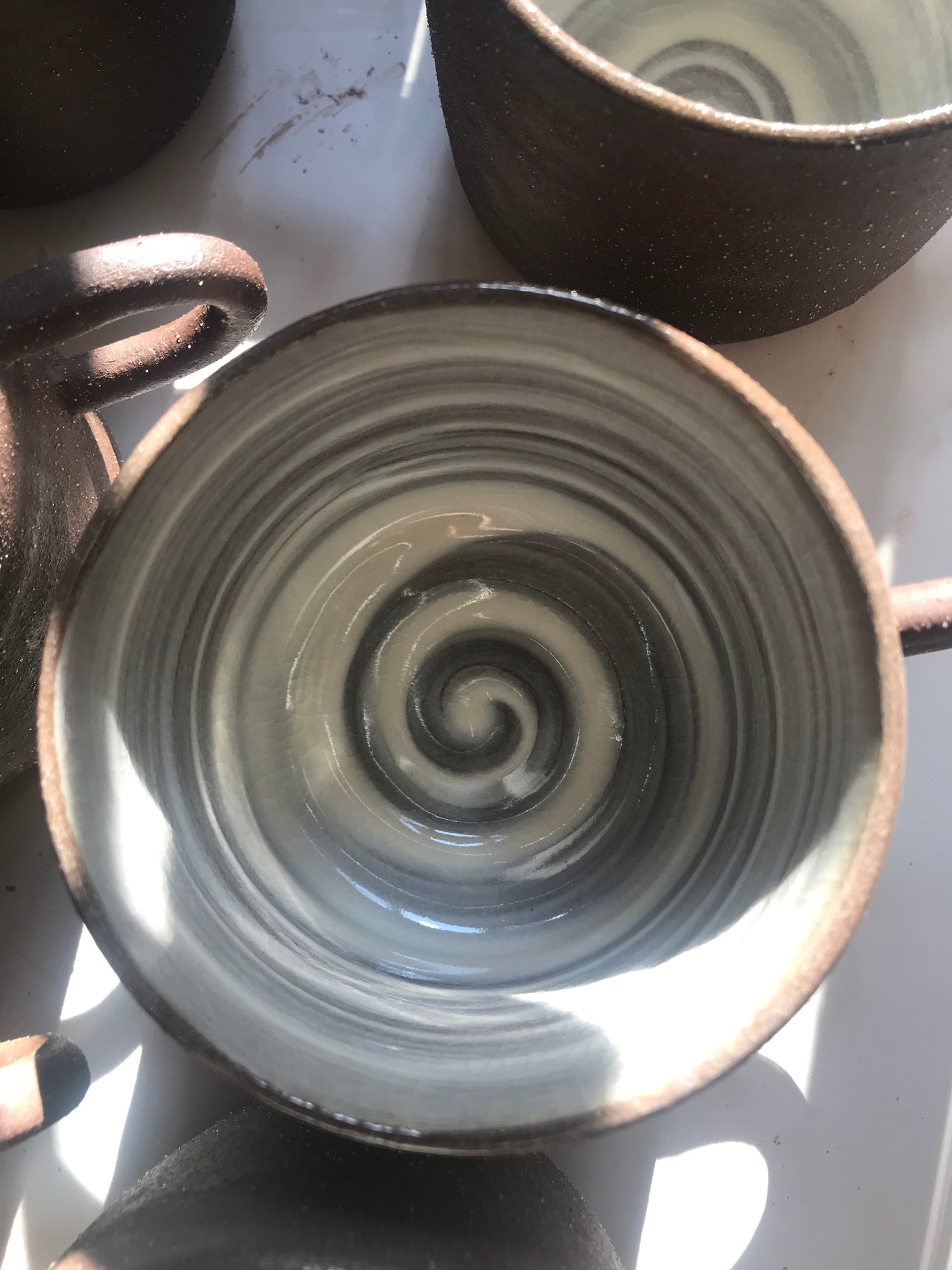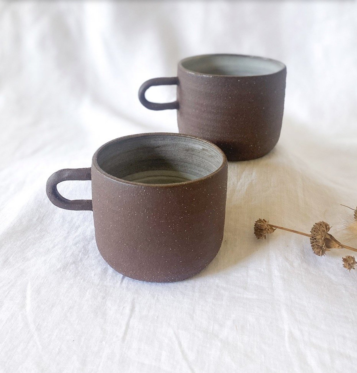 Rusty colored mug. Dark brown raw clay on the outside, slip painted with clear shiny glaze on the inside.
